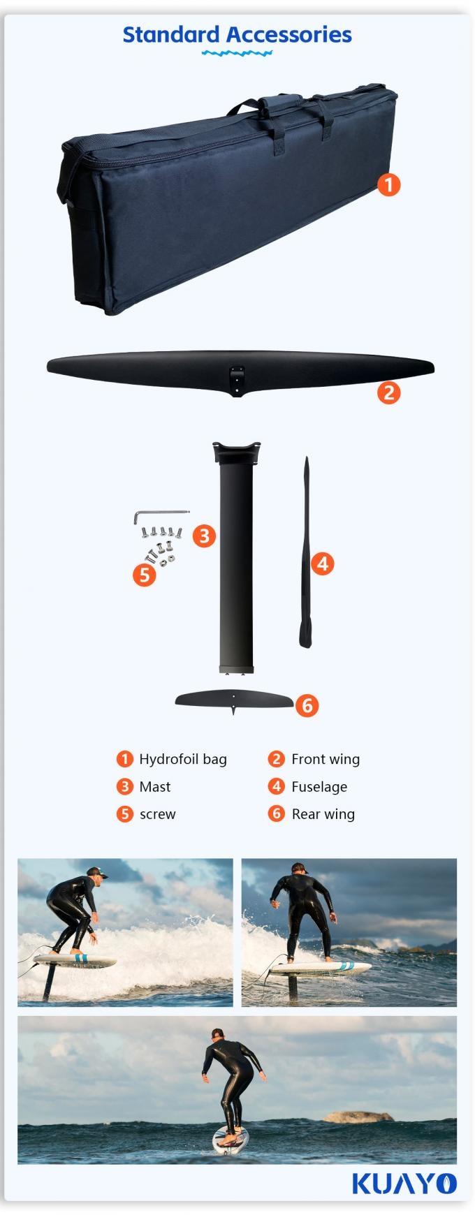In terms of detailed design, this hydrofoil fully considers practical usage needs. The surface of the hydrofoil is treated with an anti-corrosion coating, effectively resisting seawater erosion and extending its service life; the connection uses a high-strength locking structure to ensure a stable and secure fit after assembly, improving gliding safety. Furthermore, the included installation tools are simple and easy to use, allowing even beginners to quickly master the assembly techniques, balancing practicality and durability for a superior user experience for riders.